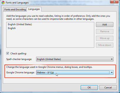 - בחלונית שנפתחה, "Fonts and Languages", בחר בלשונית השניה, "Languages", גש לאפשרות האחרונה "Google Chrome language". בחר בעברית, ולחץ על "OK".