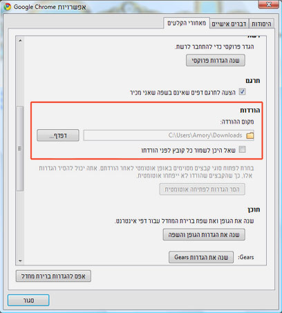 - בחלונית ה-"אפשרויות", בחר בלשונית השלישית, "מאחורי הקלעים", גלול למטה עד שתגיע לנושא ששמו "הורדות". נושא זה מאפשר לך לשנות את מקום ההורדה.
