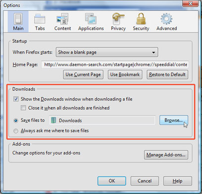 - בחלונית החדשה, בלשונית "Main", גש לאפשרויות "Downloads" ולחץ על "Browse" כדי לקבוע את מקום ההורדה המועדף עליך במחשב האישי. לחץ על "OK" בסוף התהליך.