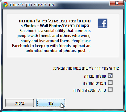 - בחלונית שנפתחה, בחר את המקום שבו אתה רוצה שיופיע הקיצור (שולחן העבודה/ תפריט ההתחלה/סרגל הפעלה מהירה), ולחץ על "צור".