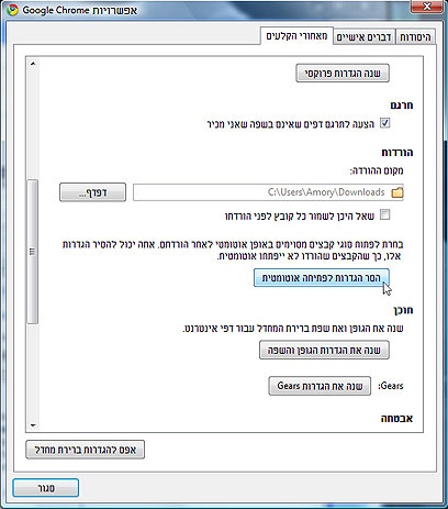 - בחלונית ה-"אפשרויות", בחר בלשונית השלישית, "מאחורי הקלעים", גלול למטה עד שתגיע לנושא ששמו "הורדות". מתחת אליו ישנו כפתור "הסר הגדרות לפתיחה אוטומטית". לחץ עליו, ולחץ על "סגור בתחתית החלונית.