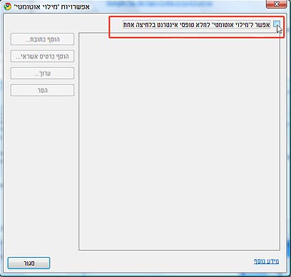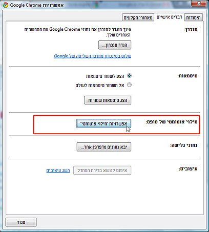 - בחלונית החדשה שנפתחה, בטל את "אפשר ל'מילוי אוטומטי' למלא טופסי אינטרנט בלחיצה אחת". ולחץ על "סגור".