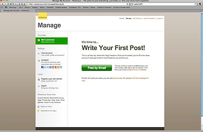 בעמוד הראשי של האתר, הכניסו את כתובת האימייל שלכם, וסיסמה ושם משתמש לבחירתכם. שם המשתמש שתבחרו יופיע כחלק מכתובת העמוד שלכם בפוסטרוס. אם תבחרו בשם Libia,למשל, הכתובת תהיה libia.posterous.com. כדי לסיים את ההרשמה, תהיו חייבים לאשר אותה בלחיצה על קישור שישלח למייל שלכם. כעת תוכלו להתחיל לעבוד. טיפ קטן: תחת Your Account, תוכלו להוסיף כתובות אימייל נוספות של חברים ושותפים, וכך ליצור אתר שותפי תוכן.