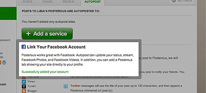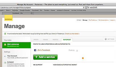 לחצו על אחד האתרים כדי לקשרם לפוסטרוס. כעת תתבקשו להתחבר לשירות, ולספק את הסיסמה והקוד שלכם. כעת עמוד הפוסטרוס שלכם יתרענן ותוכלו לראות את השירות שהתווסף. תוכלו להוסיף כמה שירותים שרק תרצו - ובכל פעם שתפרסמו תוכן - הוא יופץ לכל האתרים שרשמתם.