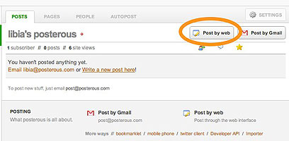בשלב זה, לפני שתקשרו בין פוסטרוס לאתרים האחרים שלכם, תוכלו להשתמש בעמוד שיצרתם כבלוג לכל דבר. כדי להעלות אליו תוכן שלחו אותו ל-post@posterous.com, רק ודאו שאתם שולחים את האימייל מהכתובת איתה נרשמתם לאתר. כאשר האימייל יתקבל, האתר ידע להפנות את התוכן אל העמוד שלכם, ויציג את שורת הנושא ככותרת ואת תוכן האימייל כפוסט. למעשה, תוכלו לשלוח אימיילים לפוסטרוס עוד לפני שתרשמו. הם ידאגו לפתוח ערוץ זמני תוך שימוש באימייל שלכם.