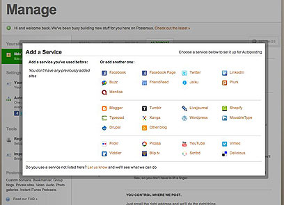 פוסטרוס יציג בפניכם חלון ובו מספר רב של אתרים אליהם תוכלו להתחבר. ביניהם תמצאו אתרים מוכרים כמו יוטיוב, פייסבוק, טוויטר, בלוגר, וורדפרס ופליקר. תמצאו שם גם אתרים מוכרים פחות בארץ, שיש להם לא מעט משתמשים בחו”ל: Jaiku, Xanga, או Scribd.