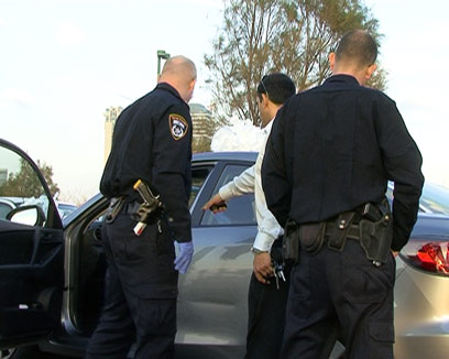החתן עם השוטרים ליד המכונית הפרוצה (צילום: אבי חי)