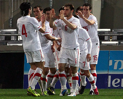 נבחרת סרביה חוגגת בבלומפילד (צילום: אלי אלגרט)
