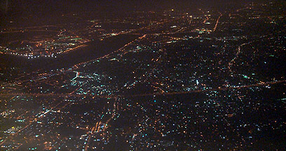 מחלון המלון אני רואה שעומס התנועה לא יורד גם בשעות הקטנות של הלילה ושפיץ של פרמידה מתנשא מעל העיר, מואר בפנסי נתרן.