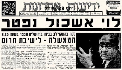 כותרת "ידיעות אחרונות" מיום מותו של אשכול, פברואר 1969