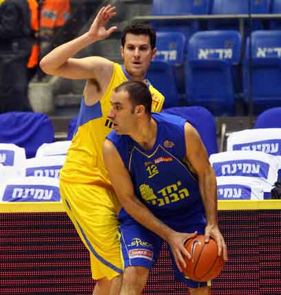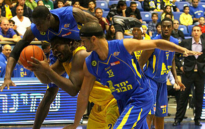 לא מצאו את הסל. גל מקל מול בן רייס (צילום: חגי אהרון)
