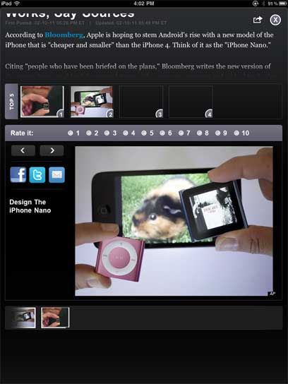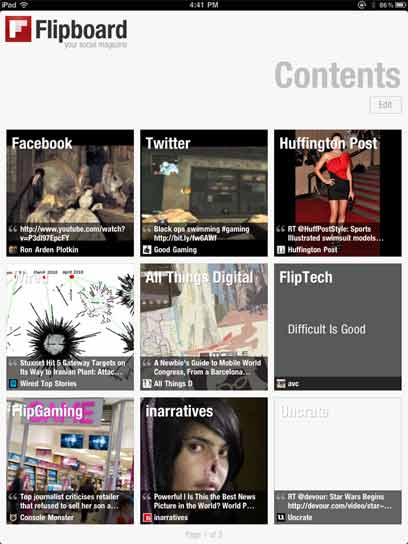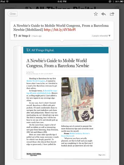 כשתפתחו כתבות של שותפי תוכן של פליפבורד, דוגמת All Things Digital, או Lonaly Planet - שימו לב לעיצוב שונה, שמעלה את הכתבה המלאה בצורה שהותאמה במיוחד לאפליקציה. גם זמן הטעינה קצר יותר וגם המבנה נוח יותר לקריאה מאשר תכנים שמגיעים מטוויטר ופייסבוק. את פליבורד ניתן להוריד חינם לאייפד, וגם כל התכנים שבו הם בחינם.