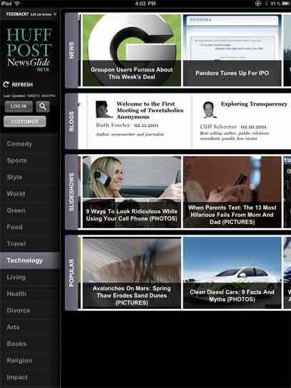 ההאפינגטון פוסט, אתר החדשות שנקנה לאחרונה על ידי AOL, מציע בגרסתו הטאבלטית עיתון חינמי (באייפד) שמאוד נוח לנווט בו. בצד שמאל של המסך תמיד מופיעים המדורים השונים, ולחיצה אחד מהם תציג במרכז המסך חלוקה קבועה לסוגי התוכן: חדשות, בלוגים, מצגות, וכתבות פופולריות.