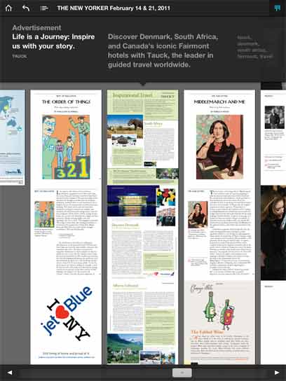 עיתון הניו יורקר מייבא לטאבלט את הכתבות האיכותיות של העיתון המודפס והמקוון. תמצאו בו ביקורות, סיפורים, המלצות לבילוי, כתבות תחקיר וכמובן את התמונות וקריקטורות הידועות שמלוות את הכתבות. גם בניו יורקר ניסו לשלב קטעי וידאו בכתבות, אך באופן חסר מעוף ושגרתי למדי. המגזין לטאבלט הוא למעשה קובץ בעצם ב-PDF מחוכם. כמו ב-Wired.