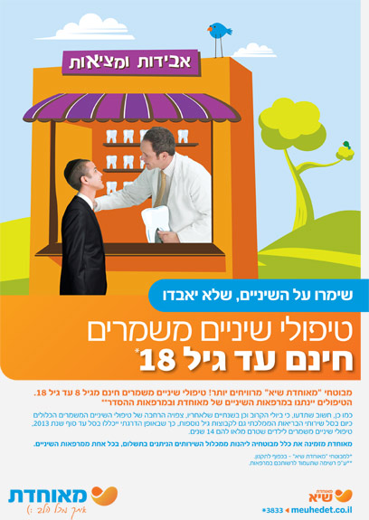 קופת חולים מאוחדת יצאה בימים האחרונים בקמפיין רחב היקף בנשא ביטוחי השיניים. לאיור של הילד במודעה הוסיפו כיפה וחליפה שחורה, אולם מה שמפתיע הוא הרופא שנותר גלוי ראש.