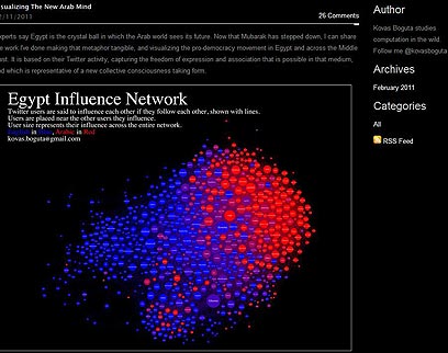 הצלחתה של המהפיכה במצרים נזקפת לזכות גורמים רבים, אבל מעל כולם מתבלטת טוויטר - רשת המיקרובלוגינג אליה הועלו דיווחים, תמונות ומידע. ניתוח של קויאס בוגוטה, ראש מחלקת הניתוח האנליטי בחברת המחקר וויבלי, יצר תמונה שמראה את ההקשרים וההשפעות של משתמשי טוויטר במצרים. איך זה נראה? ככה:
