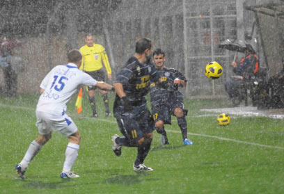 השחקנים סובלים מהגשם. הערב בקריית שמונה (אביהו שפירא)