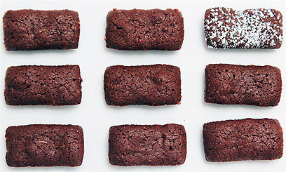 בדרך-כלל אני מכינה בראוניז בתבנית מלבנית רגילה, כמו עוגה, ולאחר שהיא מתקררת פורסת אותה לריבועים קטנים. הפעם החלטתי לחרוג ממנהגי והכנתי אותם בתבנית של שקעים מלבניים קטנים, מה שחוסך את עניין החיתוך בתום האפייה ומאפשר לחסרי סבלנות כמוני לטעום אותם מייד, בלי להמתין לצינון מוחלט.