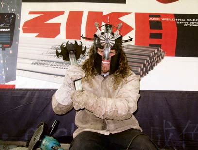 את הנקודות שעשה איציק כשקיבע את חלקי הקסדה למקומם ניסיתי אני לחבר בקווים עם רתכת CO2. במקום אלקטרודה חיצונית היא מזינה חוט באופן אוטומטי, כך שהיד קרובה יותר לנקודת הריתוך וקל יותר לדייק. כלומר, בתיאוריה: בתכלס עדיין יצאו לי כמה גושים מושפרצים, אבל כבר לא היה לי אכפת, כי כשהחזקתי את השלד השלם של הקסדה חשתי פרץ של רעיונות יצירתיים. או מרושעים. תלוי על איזה עמוד בעיתון אתה חתום.