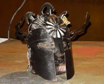 כשהחלקים היו חתוכים ומוכנים החל שלב העיגול בערגול: הצמדתי את לוחות הפח לחתיכה של צינור פלדה גדול, וכופפתי אותם והכיתי בפטיש עד שהתעגלו בדיוק במידה. אחר כך החזקתי את כל החלקים במקומם, וברגע אחד נוצר הפרצוף של הגלדיאטור.