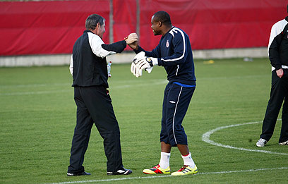 מצב רוח טוב באימון. גוטמן ואניימה (צילום: יועד כהן)