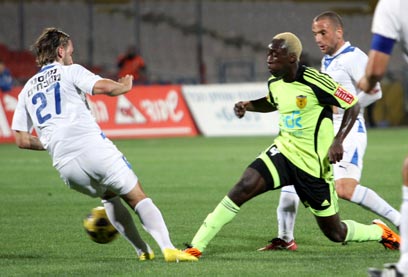 הרווה קייג' מול פביאן סטולר. בית"ר בצרות גדולות (צילום: אורן אהרוני)