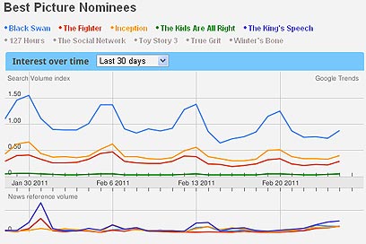 וגם אתר חיפוש טרנדים המוקדם לאוסקר, oscartrends, מציע חיפוש תחזיות זכיות להערב לפי הטרנדים הנוגעים לנושא במנוע החיפוש גוגל. תצוגת הנתונים שלהם טיפה פחות נוחות לצפייה – שימו לב ששמות המועמדים הרשומים מעל הטבלאות מיוצגים בצבעים שונים.