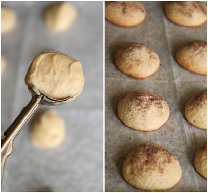 - מרפדים את תבנית התנור בנייר אפייה. בעזרת כף גלידה קפיצית קטנה (או בעזרת שתי כפיות או שק זילוף), מניחים במרווחים תלוליות קטנות וזהות בגודלן של הבלילה, על גבי נייר האפייה. (השתדלו שלא לשים כמות גדולה מדי, העוגות תופחות ומתפשטות במהלך האפייה). בוזקים מעל מעט מהסוכר והקקאו ואופים כ-9 דקות בתנור שחומם מראש לטמפ' של 190 מעלות, עד שהעוגות מתייצבות ומזהיבות קלות בתחתית. מוציאים מהתנור ומצננים לחלוטין.