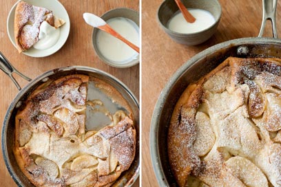 בגרמנית קוראים לה אפפל-פאנ-קוכן (Apfelpfannkuchen), הכירו את חלופה הקלילה לעוגת תפוחים (שנוספו לה גם אגסים). הפנקייק מתחיל במחבת חמה עם תפוחים ואגסים שמתבוססים בחמאה, סוכר וקינמון. או אז יוצקים למחבת את בלילת הפנקייק, ושולחים ישר לתנור. הבלילה תתפח ותצא גבוהה ואוורירית, כשבחוץ מעטה פריך וזהוב ששומר שמבפנים היא תישאר רכה ונימוחה. מגישים מייד, עם יוגורט או שמנת חמוצה.