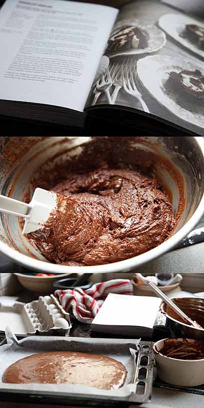 כשחברה טובה סיפרה שהיא נוסעת לסוף שבוע בלונדון, מייד ביקשתי שתביא לי את הספר השני שלו "The Chocolate Bible" וכמובן - חפיסת שוקולד, כדי שאוכל לטעום את טעמי הסרט. לשמחתי הרבה גיליתי שהספר מצולם מדהים ומעורר תיאבון בצורה שרק שוקולד יכול. זה ספר סקסי, מלוכלך ולא מהוקצע. לא ספר לקונדיטורים, אלא לבשלנים. אחד המתכונים שבחרתי להכין היה רולדת שוקולד וקצפת - מתכון שלוקח אותי כמה עשורים אחורה, והייתה לי תחושה שהמתכון שבספר ייתן לעוגה הזו כיוון אחר.