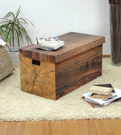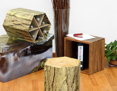 נראה כמו עץ, אבל מקרטון. שולחן וארגז אחסון של קרום