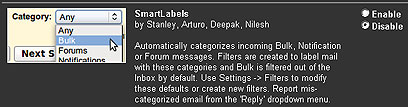 שלוש הקטגוריות הראשונות (Bulk, Notifications ו-Forums) אף מוסיפות כבר תווית אוטומטית למיילים שלכם בתיבה - לחיצה על התווית, למשל Bulk, תביא את כל המיילים שסומנו כך. כך זה נראה.