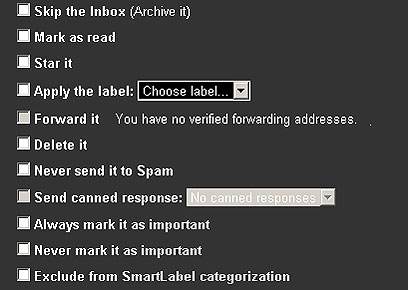אחרי שבחרתם קטגוריה (ואולי חיתוכים נוספים - כמו כתובת שממנו הגיע המייל וכדומה), בחרו מה לעשות עם המיילים שמגיעים מכל קטגוריה. לפי הסדר בתמונה: