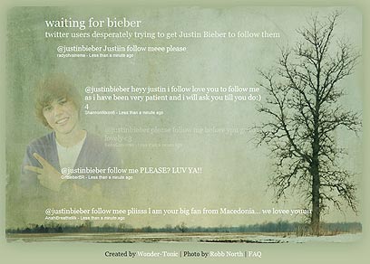 המון נערים ונערות-- סליחה, ילדים וילדות שמשום מה חושבים שמגיע להם חשבון טוויטר רוצים שג'אסטין ביבר יעקוב אחריהם. מייק ראה את הציוצים האלה וחשב שיהיה משעשע לקבץ את כל הפתטיות במקום אחד, שכל העולם הבוגר ידע: סקס? מה פתאום. ארוחת גורמה? שכחו מזה. אני רק רוצה שג'סטין ביבר יעקוב אחרי. מחכים לביבר הוא התוצאה ובאתר מוצגים הציוצים בזמן אמת של ילדים שזועקים לשמיים "אלוהים, תעשה שג'אסטין ביבר יעקוב אחרי!"
