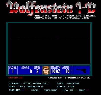 זוכרים את Wolfenstein 3D, משחק המחשב הקלאסי ופורץ מ-1992? כן, זה שיורים בקצינים נאצים ובסוף נלחמים בהיטלר שנמצא בתוך חליפת רובוט. היום זה נשמע קצת מוזר, באמת. וולפנשטיין התגאה בכך שהוא "3D" - וב-1992 כשאמרו תלת ממד לא התכוונו לדבר הזה עם המשקפיים המצחיקים, אלא שהמשחק מוצג מנקודת מבטו של השחקן. היום הממשק הזה, שנקרא First Person Perspective, משמש כל משחק יריות, ו-3D לא נשמע כל כך מלהיב. אז מייק יצר גירסה חד-מימדית של המשחק. משחק בחד-מימד אומר שכל המשחק מתרחש במפה רחבה, אבל בגובה של פיקסל אחד בלבד. כן, מגיב 19, אנחנו יודעים שגובה של פיקסל אחד זה הופך את זה לדו-מימדי, אבל בוא לא נהרוס את הכיף. באופן משונה, עדיין אפשר לשחק במשחק אם מבינים את החוקיות: פס בצבע תכלת זה דלת, פס צהוב זה הגביע שנותן נקודות, פס סגול זה תחמושת וכן הלאה. למעשה, המשחק הרבה יותר מעניין ככה.