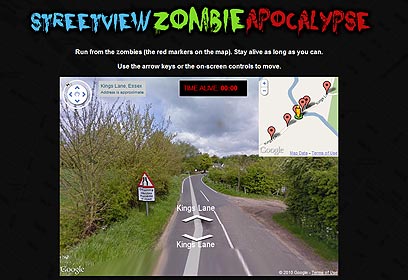 יצא לכם כבר להשתמש בגוגל StreetView כדי לסייר בערים באופן וירטואלי? לא מעניין, נכון? ומה אם נוסיף לשם זומבים? מייק יצר את Streeview Zombie Apocalypse, משחק שמתלבש על גוגל סטריט וויו - כן, ומוסיף לו זומבים. המטרה שלכם: לברוח מהם ולהישאר בחיים כמה שיותר זמן. האמצעי: ניווט ברחובות עם הכלים של סטריט וויו. כדי להתחיל לשחק אתם צריכים להזין כתובת שאתם יודעים שנסרקה על ידי הרכבים של גוגל. אנחנו הצלחנו לשרוד שלוש דקות לפני שצעקו עלינו לחזור לעבוד.