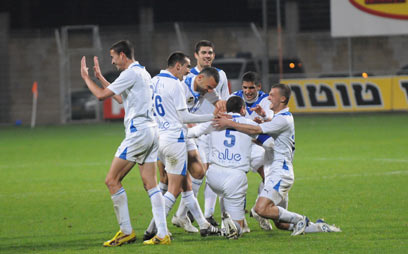 שחקני קריית שמונה חוגגים. הקבוצה הטובה ניצחה (צילום: אביהו שפירא)