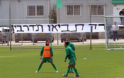 השלט אומר הכל. אימון מכבי חיפה היום (ש') בכפר גלים (צילום: ערן לוף)
