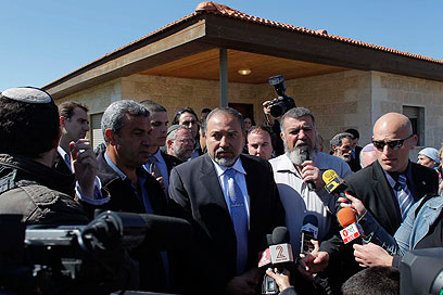 ליברמן בבית משפחת פוגל. "יש פה בית הריגה" (צילום: AP)