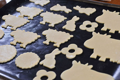- מרדדים את הבצק לעובי 2-3 מ"מ על משטח מקומח וקורצים את העוגיות.