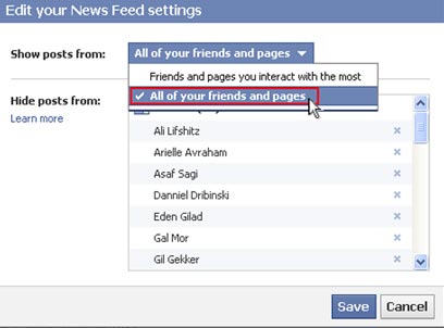 - בחלונית שנפתחה, פתחי את האפשרות הראשונה "Show posts from:", ובחרי באפשרות "All of your friends and pages". לחצי בתחתית החלונית על Save, ורענני את עמוד הבית.