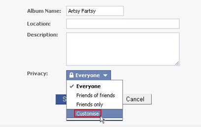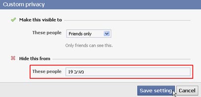 - בחלונית שנפתחה של הגדרת הפרטיות, גש לאפשרות השניה, "Hide this from", והקלד את שמות האנשים שמהם אתה רוצה להסתיר את האלבום. לחץ על Save – וסיימת.