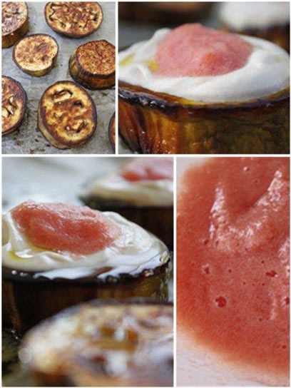 - מעבירים את העגבניות המרוסקות במסננת דקה ומתבלים במעט מלח גס. מתקבל מעין קצף עדין ואוורירי של עגבניות. מניחים כפית מהקצף הזה בראש פרוסת החציל עם הטחינה.