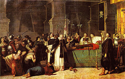 לאחר שדחה את הצעתו של האח וינסנט ואלוורד להיכנע לחוקי הנצרות, והשליך את ספר התנ"ך שלו בבוז על הרצפה, לא נשאר לאטאואלפה אלא להשקיף מן הצד כשהספרדים השמידו את צבאו, תוך שהם מסתמכים בעיקר על האימה שזרו סוסיהם (חיות שבני האינקה לא הכירו).