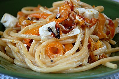 מקרוני עם פלפלים צהובים קלויים וגבינת פטה (צילום: יעל גרטי)
