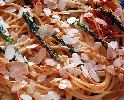 מאפה מקרוני עם אספרגוס, מוצרלה ושבבי שקדים