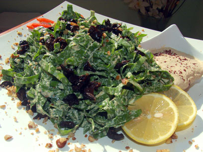 סלט מנגולד וזיתים שחורים ברוטב פקאנים