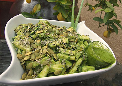 - הערה: הקישואים במתכון הזה מוגשים חיים, והם ממש טעימים – זו אחת המנות הפופולריות במסעדה. עבור מי שמתקשה לאוכלם חיים, אפשר להניח בפיירקס, למשוח במעט שמן זית ולאפות בתנור בחום של 48 מעלות, עם דלת חצי פתוחה, 3-4 שעות. לאחר מכן להוסיף את הפסטו.