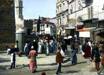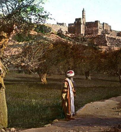 6. ירושלים, 1913, ליד שער יפו. נראה מגדל השעון בשער. מגדל השעון על גג שער יפו נבנה בשנת 1907, מאבן גיר שנחצבה במערת צדקיהו הסמוכה. המגדל הוקם כמחווה לסולטאן עבדול חמיד השני במלאת 25 שנה לשלטונו.