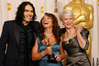 בייר בחברת הלן מירן וראסל ברנד בטקס האוסקר (צילום: MCT)